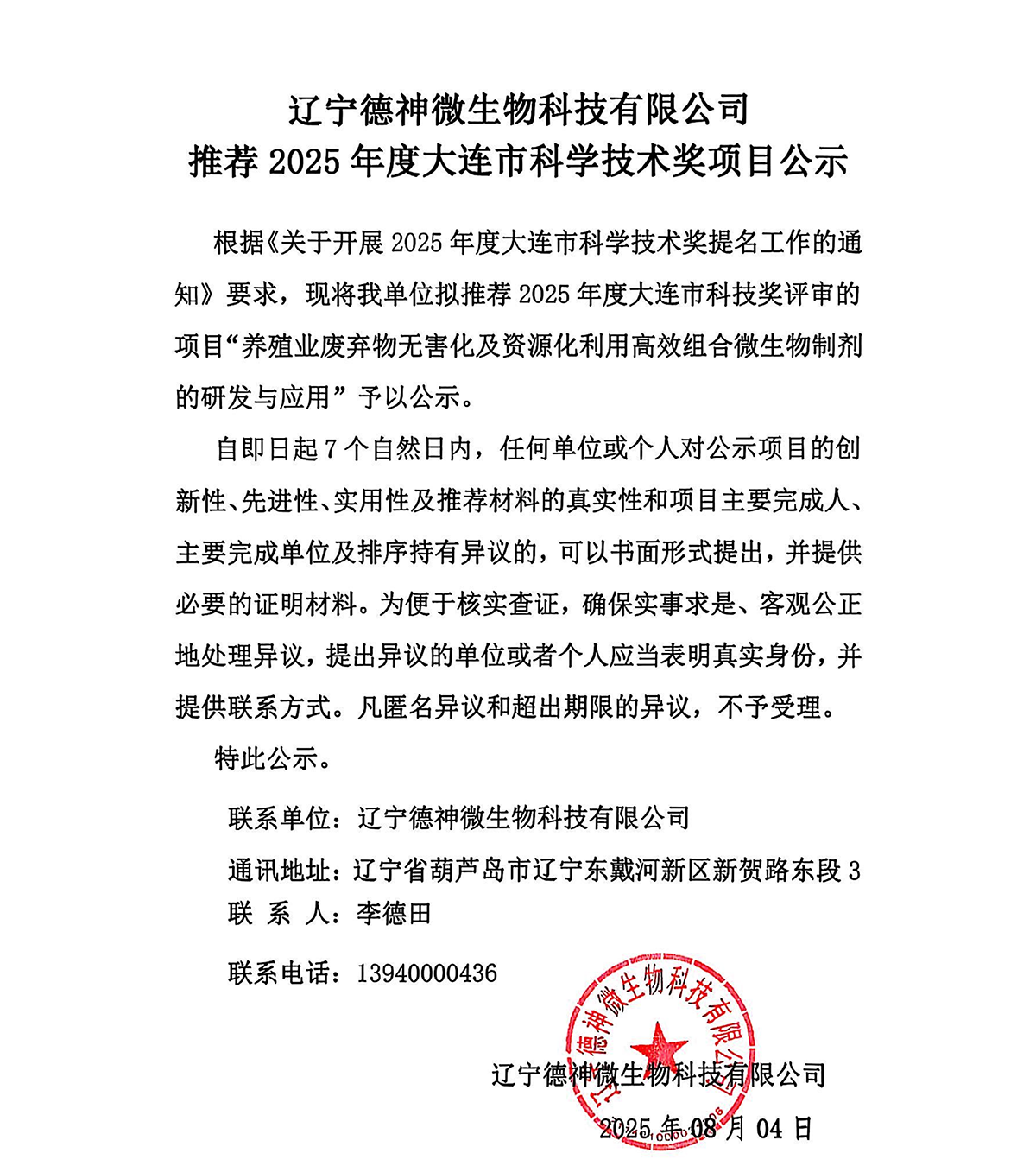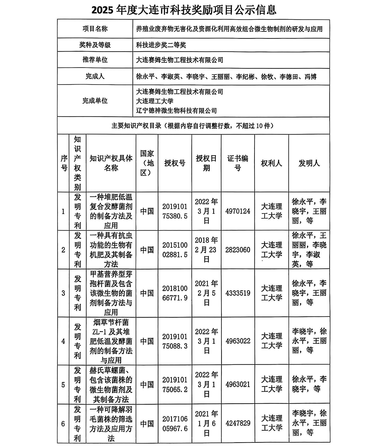 遼寧德神微生物科技有限公司推薦 2025年度大連市科學技術獎項目公示